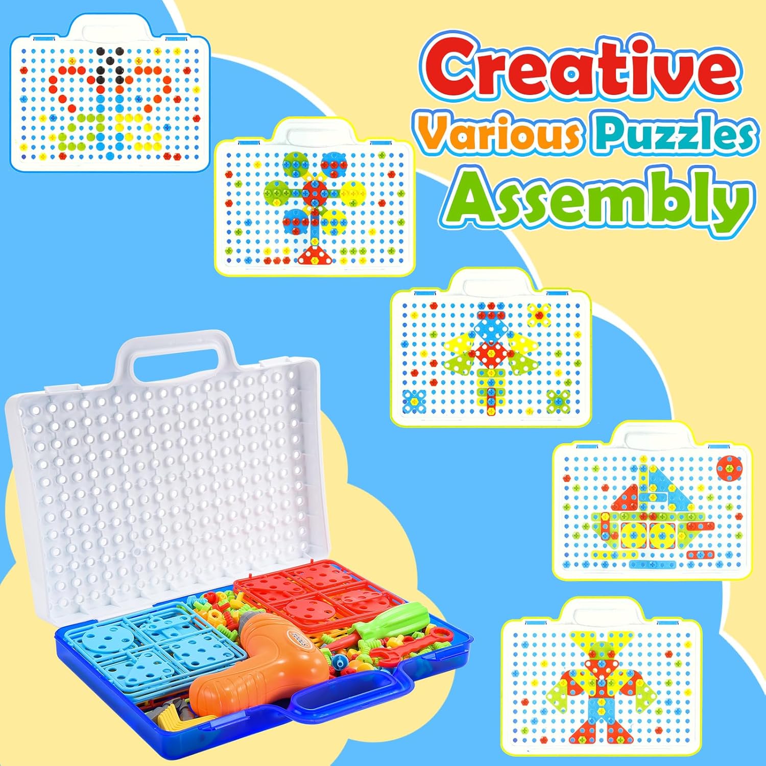This educational building toy comes with a child-safe electric drill, screwdriver, bolts, and colorful mosaic pieces, allowing kids to build their own 3D models, animals, cars, and robots. The rotating drill helps children understand basic mechanical principles while having fun.
